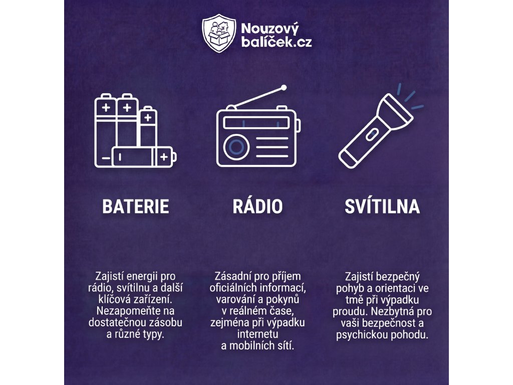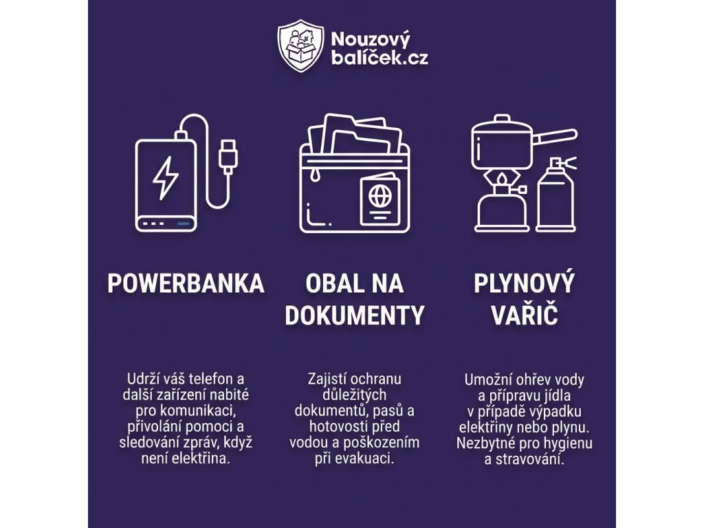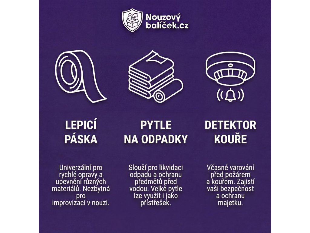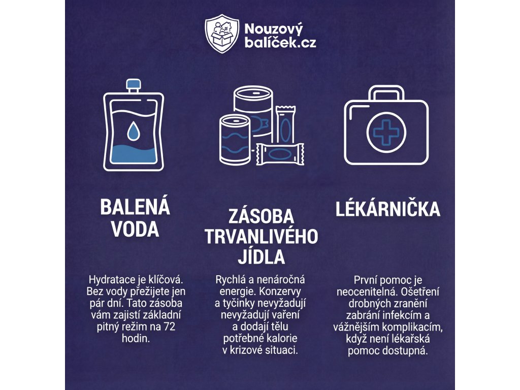 Obsah balíčku vychází z oficiálních doporučení a praktických zkušeností z mimořádných událostí. Kromě základních životních potřeb přidává nástroje a vybavení zvyšující soběstačnost, bezpečnost a komfort při delším omezení běžného fungování.