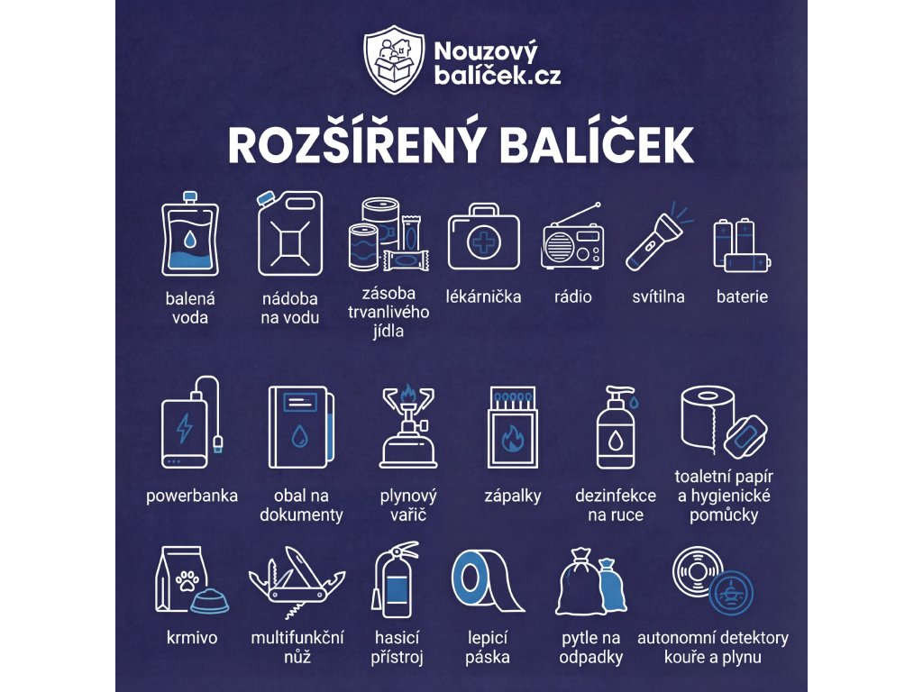 Rozšířený nouzový balíček pro 72 hodin obsahuje vše důležité pro zvládnutí krizové situace: pitnou vodu, kanystr, trvanlivé jídlo, lékárničku, rádio a svítilnu na baterie, powerbanku s náhradními bateriemi, plynový vařič, hygienické potřeby, dezinfekci, toaletní papír, multifunkční nůž, hasicí deku, lepící pásku a pytle na odpadky. Kompletní výbava pro bezpečí celé domácnosti. Spotřebovatelné zásoby jsou v balíčku pro 2 osoby.